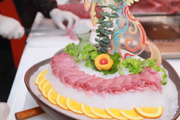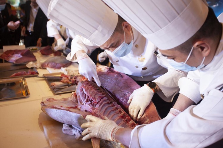 开鱼仪式结束后,在酒店厨师长精湛的刀工下,酒店精心准备的多道蓝鳍金枪鱼特色菜品及单品依次呈上,现场宾客们纷纷举起手机记录美味瞬间,不时发出赞叹,沉浸在这场味觉与视觉的双重盛宴中。